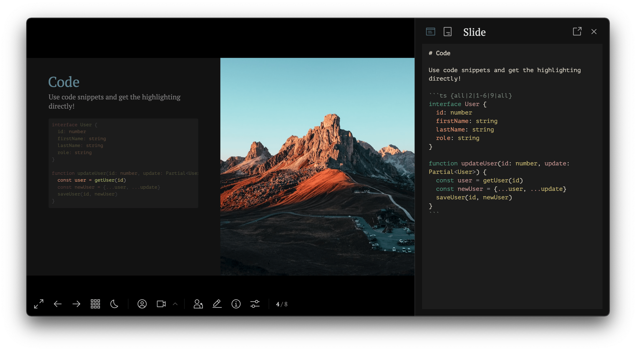 Slidev comes with an integrated CodeMirror editor that will instantly reload and save the changes to your file.