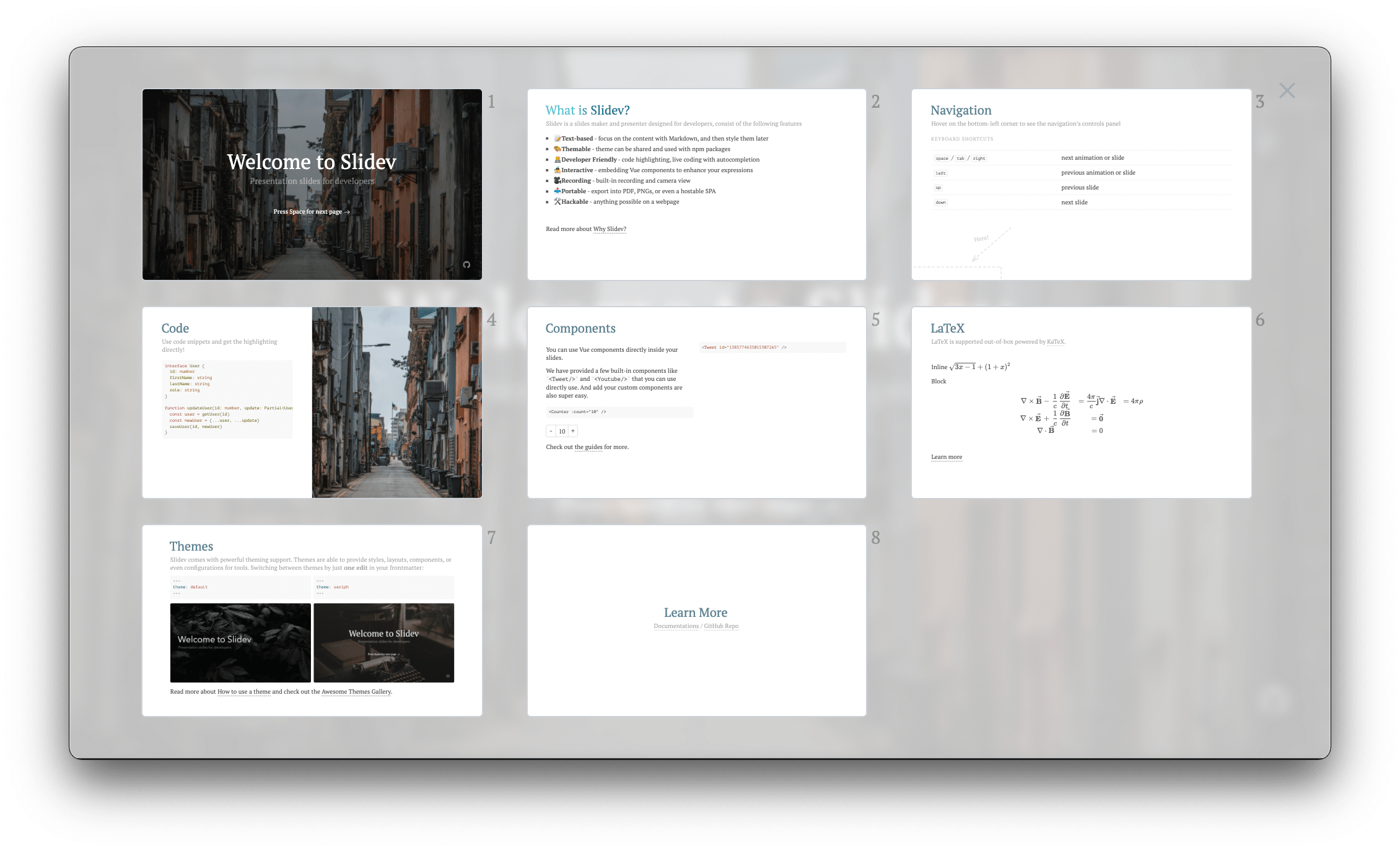 By pressing o or clicking the button in the navigation bar, you can have the overview of your slides so you can jump between them easily.